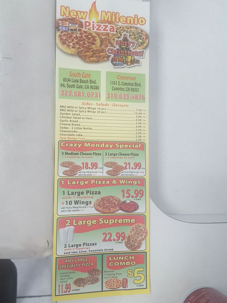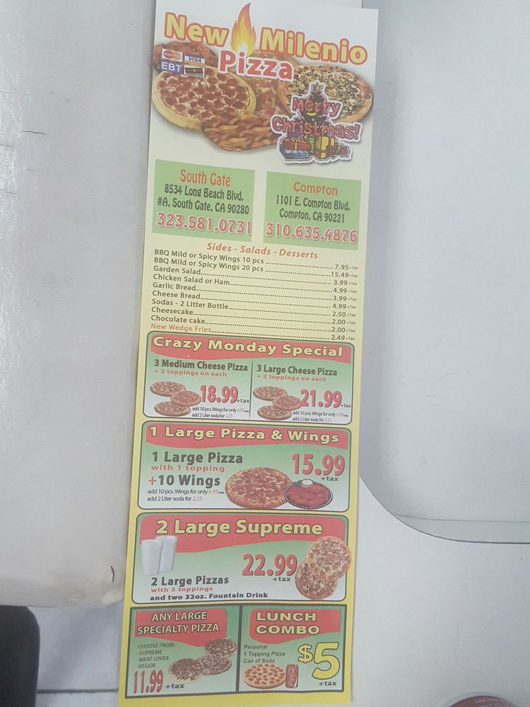Welcome to New Millennium Pizza, a hidden gem nestled at 1101 E Compton Blvd in Compton, CA. Known for its fantastic flavor and family-friendly atmosphere, this pizza haven offers both delivery and takeout options, making it a convenient choice for any occasion.